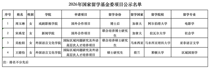 根据上级有关文件要求,经学生申请、学院审核推荐、国际交流与合作处审核,我校拟向国家留学基金委推荐以下人员参加2026年国外合作项目、国际区域问题研究及外语高层次人才培养项目,现将拟推荐名单公示。公示时间:2026年4月2日-4月8日公示期间,如对推荐人选的资格条件等有异议,请于2026年4月8日之前将有关意见发至国际交流合作处邮箱:ixchange@cuc.edu.cn 。